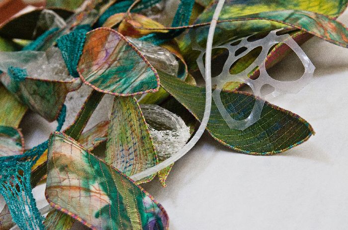 Hand dyed and painted silk, quilting, shaping, found objects.